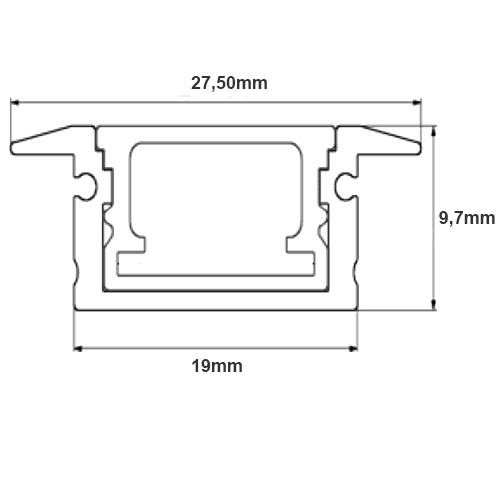 As dimensões do perfil são 9,7mm de altura por 19mm de largura, com um beiral de 27,50mm, proporcionando uma aparência discreta e elegante. Ele é adequado para diversos ambientes, como cozinha, quarto, salas, hall, lavabo, closet, varanda, corredores e banheiro.