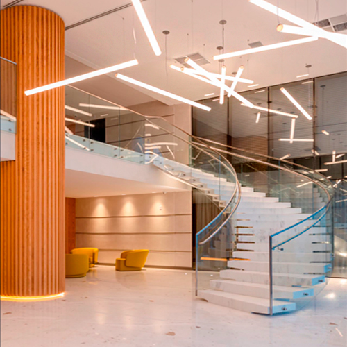 Para quem busca criar um destaque especial, o Perfil Pendente Tubular 60/80mm também se encaixa perfeitamente em escadas, mobiliários e armários planejados, agregando funcionalidade e elegância. Seu difusor translúcido em PMMA extrusado garante uma iluminação uniforme, sem ofuscamento, tornando o espaço mais confortável e convidativo.