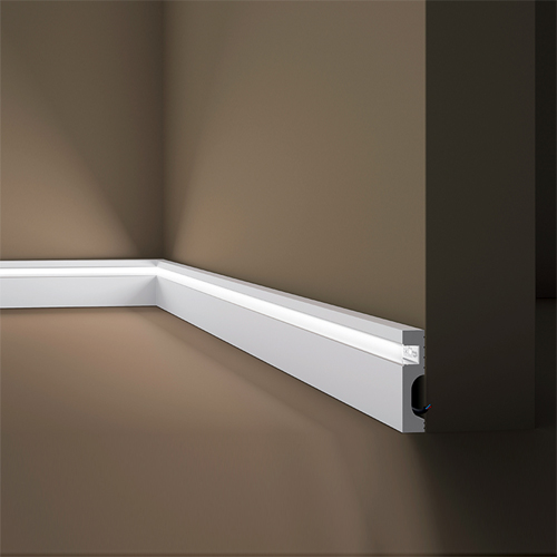O Perfil Sobrepor L11 é uma peça decorativa fabricada com poliestireno extrusado de alta densidade, na cor branca, projetada para aplicações internas. Seu design inteligente inclui um espaço específico para a instalação de FITA LED, proporcionando uma iluminação indireta única.
