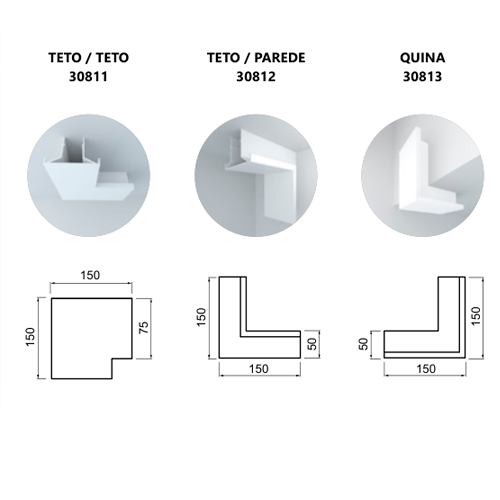 Junção Sobrepor Trovão Teto/Teto: 10cm. / Junção Sobrepor Trovão Teto/Parede: 10cm. / Junção Sobrepor Trovão Quina: 10cm.