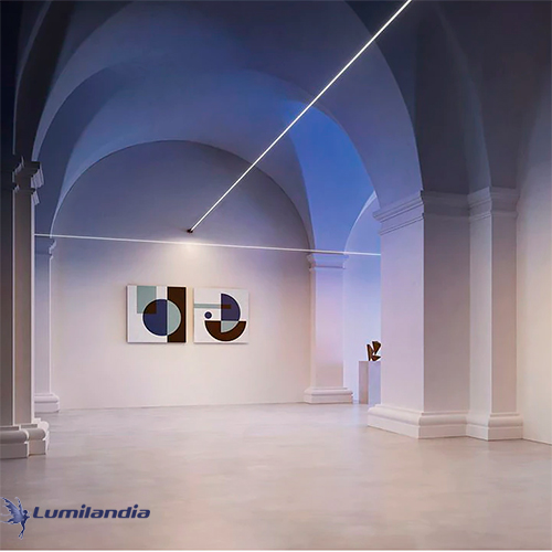 O perfil possui alta qualidade de iluminação com um Índice de Reprodução de Cor (IRC) superior a 80, garantindo cores nítidas e reais. Sua instalação é simples e segura, com fixação tensionada entre dois pontos usando suportes específicos, garantindo um design limpo e sem emendas em projetos de até 3 metros.