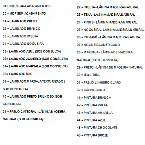 Acabamento: Madeira: Pinus- Freijó – Imbuia – Arauco – Teca – Nogueira – Cúmaru – Marsala – Cappuccino – cores sob encomenda.