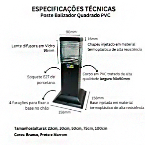 A manutenção é simples, exigindo apenas detergente neutro e pano úmido para limpeza. Com garantia de 12 meses contra defeitos de fabricação, o Poste Balizador Quadrado é uma escolha confiável e de qualidade. Vale lembrar que a instalação deve ser feita por um profissional capacitado, assegurando o melhor desempenho e segurança do produto.
