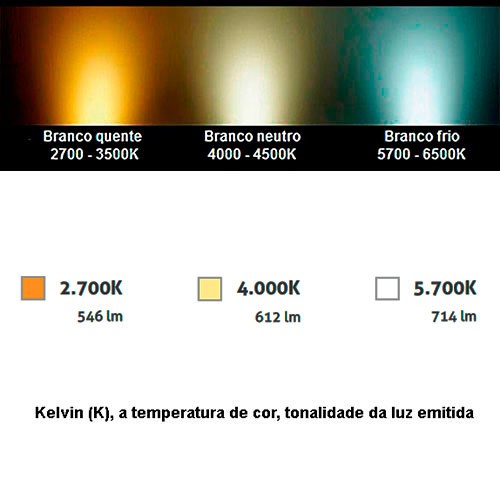 • Cor do LED: Branco Quente (2700K) / Branco Neutro (4000K) / Branco Frio (5700K) – opcional Vermelho, Verde, Azul, Âmbar
