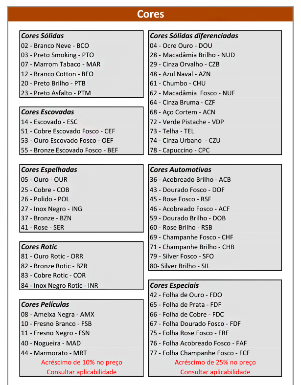 Disponível nas Cores: Cores: Sólidas, Automotivas e Espelhadas, veja palheta