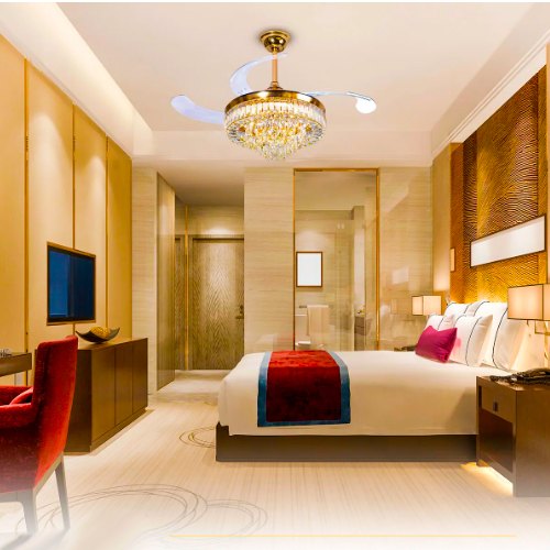 Ventilador Cristal LED multicolor com quatro pás, o ventilador opera silenciosamente com um RPM de 230, proporcionando um ambiente agradável. Sua grande diâmetro de 1060mm o torna adequado para espaços maiores.